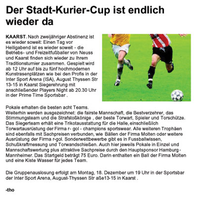 Kaarster Stadtspiegel / Extra Tipp Kaarst: "Der Stadt-Kurier-Cup ist endlich wieder da"; Pressebericht zum Stadt-Kurier Cup Neuss / Kaarst 2006