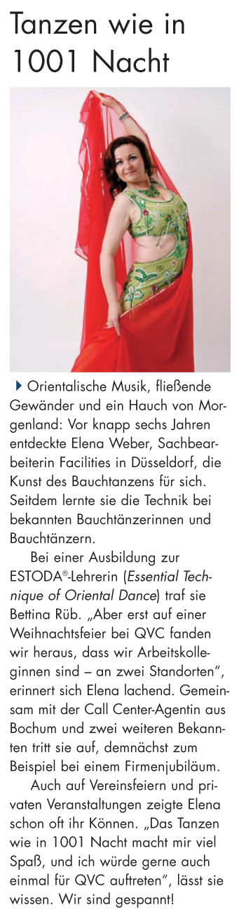 Mitarbeiterzeitung QVC Together - Das Mitarbeitermagazin der QVC Deutschland Gruppe, Ausgabe November / 4.2008, Herausgeber: QVC Deutschland Inc. & Co. KG, Düsseldorf: "Tanzen wie in 1001 Nacht - Orientalische Musik, fließende Gewänder und ein Hauch von Morgenland: Vor knapp sechs Jahren entdeckte Elena Weber, Sachbearbeiterin Facilities in Düsseldorf, die Kunst des Bauchtanzens für sich. Seitdem lernte sie die Technik bei bekannten Bauchtänzerinnen und Bauchtänzern..." - Presseartikel (Vorabbericht) zur Bauchtanz-Show von Soraya und ihrem Team (Auftritt im Quartett mit den Bauchtänzerinnen Soraya, Jessenia, Awerie Fay und Eljana) bei Unternehmensveranstaltung "NIGHT OF THE TRUE NORTH" 2009 anlässlich der Preisverleihung "True North Award" beim Fernsehsender QVC Düsseldorf (Rhein Studios), QVC Deutschland Inc. & Co. KG