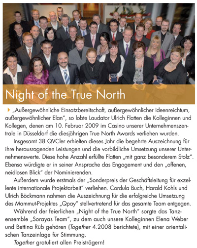 Mitarbeiterzeitung QVC Together - Das Mitarbeitermagazin der QVC Deutschland Gruppe, Ausgabe Mai / 2.2009, Herausgeber: QVC Deutschland Inc. & Co. KG, Düsseldorf: "Night of the True North - "Außergewöhnliche Einsatzbereitschaft, außergewöhnlicher Ideenreichtum, außergewöhnlicher Elan", so lobte Laudator Ulrich Flatten die Kolleginnen und Kollegen, denen am 10. Februar 2009 im Casino unserer Unternehmenszentrale in Düsseldorf die diesjährigen True North Awards verliehen wurden..." - Presseartikel (Nachberichterstattung) zur Bauchtanz-Show von Soraya und ihrem Team (Auftritt im Quartett mit den Bauchtänzerinnen Soraya, Jessenia, Awerie Fay und Eljana) bei Unternehmensveranstaltung "NIGHT OF THE TRUE NORTH" 2009 anlässlich der Preisverleihung "True North Award" beim Fernsehsender QVC Düsseldorf (Rhein Studios), QVC Deutschland Inc. & Co. KG