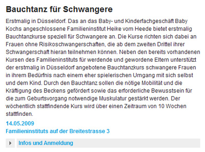 Radiosender / Lokalradio Antenne Düsseldorf: "Bauchtanz für Schwangere - Erstmalig in Düsseldorf", Pressebericht mit Vorankündigung zum neuen Bauchtanzkurs "Bauchtanz in der Schwangerschaft" - "Bauchtanz für Schwangere" ist ein Kursangebot in Kooperation mit Familieninstitut Heike vom Heede in Zusammenarbeit mit Baby Kochs Düsseldorf
