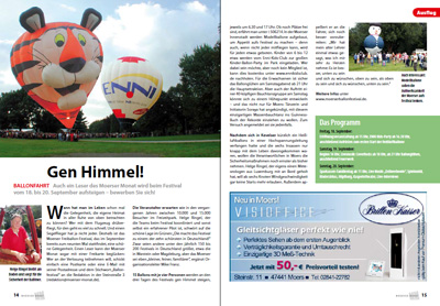 Magazin Moerser Monat, Ausgabe September 2009 [Herausgeber: Verkehrs- und Heimatverein Moers e.V.]: "«Gen Himmel!» Ballonfahrt - Auch ein Leser des Moerser Monat wird beim Festival vom 18. bis 20. September aufsteigen - bewerben Sie sich!" - Pressebericht zur Bauchtanz-Show beim Ballonglühen auf dem 9. Moerser Freiballonfestival [Montgolfiade] mit 90 Bauchtänzerinnen unter der künstlerischen und organisatorischen Gesamtleitung von Bauchtänzerin Soraya