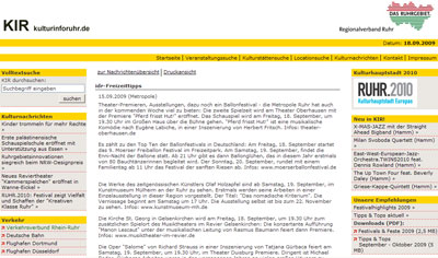 KIR: kulturinfo ruhr - Kulturportal für die Metropole Ruhr [Herausgeber: Regionalverband Ruhr, Essen] / idr-Freizeittipps: "Theater-Premieren, Ausstellungen, dazu noch ein Ballonfestival - die Metropole Ruhr hat auch in der kommenden Woche viel zu bieten: Es zählt zu den Top Ten der Ballonfestivals in Deutschland: Am Freitag, 18. September startet das 9. Moerser Freiballon Festival im Freizeitpark. Am Samstag, 19. September, findet die Enni-Nacht der Ballone statt. Ab 21 Uhr gibt es dann Ballonglühen, das in diesem Jahr erstmals von 80 Bauchtänzerinnen begleitet wird..." - Pressebericht zur Bauchtanz-Show beim Ballonglühen auf dem 9. Moerser Freiballonfestival [Montgolfiade] mit 90 Bauchtänzerinnen unter der künstlerischen und organisatorischen Gesamtleitung von Bauchtänzerin Soraya