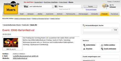 Internetportal meinestadt.de, Lokalteil Moers, Rubrik: Veranstaltungen Moers > Festivals > Open Air [Herausgeber und Provider: allesklar.com AG, Siegburg]: "«Event: ENNI-Ballonfestival, 18.09.2010» - Von Freitag bis Sonntag feiern wir zusammen mit vielen Stars auf der Bühne das ENNI-Ballonfestival. Freitag: Audi A1 Party, Samstag: Bühnenprogramm u.a. mit Monrose und traditionellem Ballonglühen, Sonntag: Sparkassen-Familientag" - Pressebericht mit Nachlese und Nachberichterstattung zur Bauchtanz-Show beim Ballonglühen auf dem 9. Moerser Freiballonfestival [Montgolfiade] mit 90 Bauchtänzerinnen unter der künstlerischen und organisatorischen Gesamtleitung von Bauchtänzerin Soraya (mit Foto der Bauchtänzerinnen) und Vorabbericht zum 10. ENNI Ballonfestival 2010 des Festival-Hauptsponsors ENNI - Energie Wasser Niederrhein GmbH, Moers