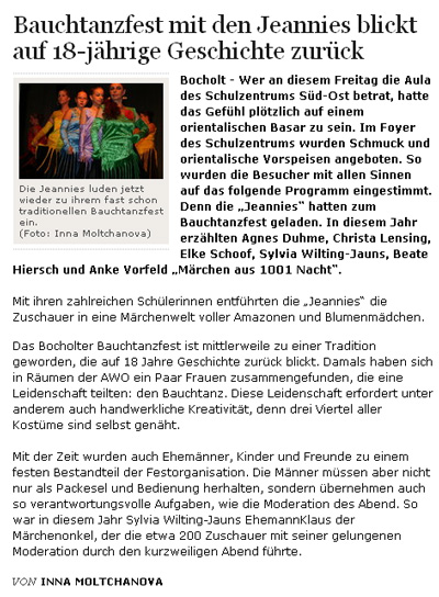 Pressemeldung bei ivz-online.de nachlesen: Bauchtanzfest mit den Jeannies blickt auf 18-jährige Geschichte zurück (Ibbenbürener Volkszeitung / ivz-online.de, 09.11.2010)