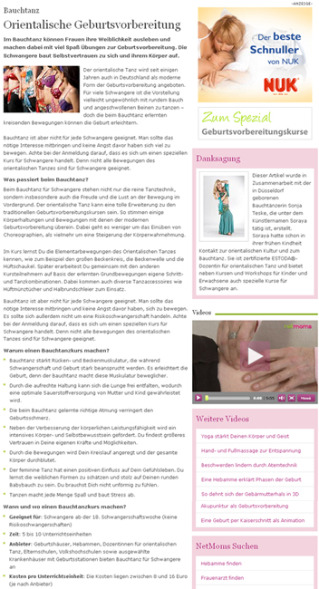 Onlineportal NetMoms.de: "Bauchtanz - Orientalische Geburtsvorbereitung: Im Bauchtanz können Frauen ihre Weiblichkeit ausleben und machen dabei mit viel Spaß Übungen zur Geburtsvorbereitung. Die Schwangere baut Selbstvertrauen zu sich und ihrem Körper auf..." - Soraya als Co-Autorin "Bauchtanz - Orientalische Geburtsvorbereitung" auf NetMoms.de: Auf Anfrage von 'netmoms - Das Portal für Mütter' schreibt Soraya als Co-Autorin in Zusammenarbeit mit der NetMoms-Redaktion den Artikel "Bauchtanz - Orientalische Geburtsvorbereitung" innerhalb des Spezial zum Thema Geburtsvorbereitungskurse [weitere Themen im Spezial: Geburtsvorbereitung mit klassischem Geburtsvorbereitungskurs und Akupunktur; Entspannt und fit mit Atmung und Meditation (Atemtherapie, Autogenes Training, HypnoMentale Geburtsvorbereitung), Bewegung (Yoga, Schwangerschaftsgymnastik, Wassergymnastik, Bauchtanz, Qigong, Zilgrei) und Massage (Shiatsu, Wasser-Shiatsu)]